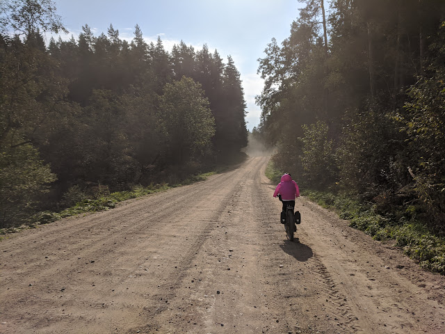 Ехать тяжело. Тут ещё и рельеф добавляется. Потихоньку начинает накрывать уже знакомая нам дневная немощь, чувствуем затылками её душное дыхание. :) По сторонам от дороги особенно не на что смотреть. Лес как лес. Но часто попадаются постройки и деревни, да и горочки вносят какое-то разнообразие. В целом, едется весьма неплохо. Я думал, будет хуже. Когда начался грейдер, мы практически сразу сбросили давление в колёсах, и теперь просто крутим без особых страданий. Спасибо широким покрышкам.
